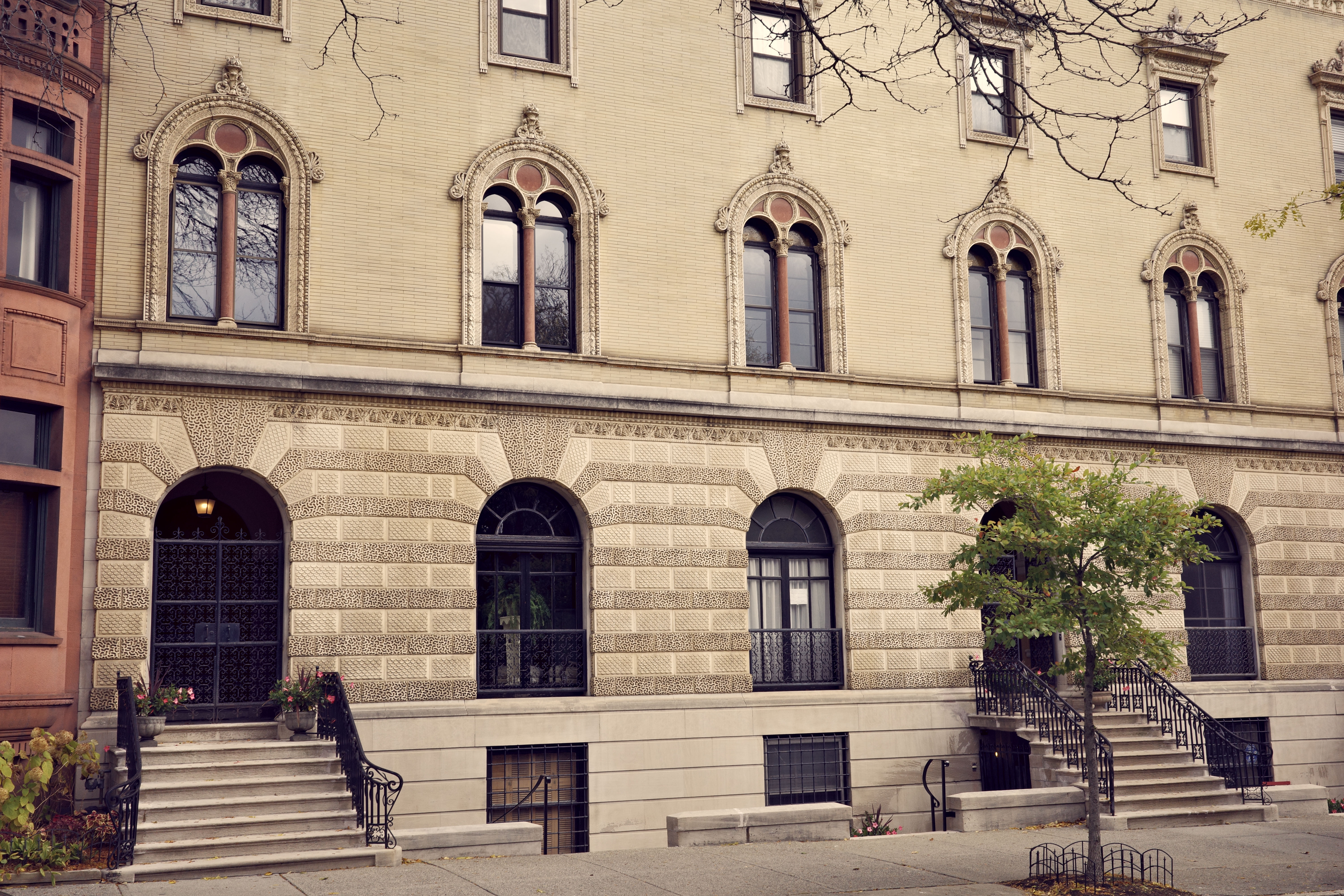 Constructed in 1897, the three-building row at 385-389 State Street is a shining example of the Renaissance Revival style that was one of the final notes in the golden age of American architecture before eclectic modes began to absorb, combine, and refine the moods of half a century. State Street's Washington Park corridor is home to several fantastic Renaissance Revival structures at 415/423 and 429, but this Marcus T. Reynolds' design is the grandest of them all. The most striking feature is the terracotta panels adorning the first floor. Alternating bands of fish-scale and vermiculation give this row an utterly unique look. However, the style is most prominently realized in the second story windows with their elegant Corinthian capital mullions and extravagant molding. The adornment continues to the roof line where an elaborate frieze and cornice top off this spectacular facade. The coherence of the style across three different buildings and the rich details make this one of Albany's finest residential properties. The Renaissance Revival style was a natural fit for its age. The realities of American industrial society had begun to set in and the refrained sophistication’s of the Italianate and Romanesque Revival styles gave way to an unabashedly ornate school of design. Renaissance Revival architecture was maturing as the American Renaissance was waning.