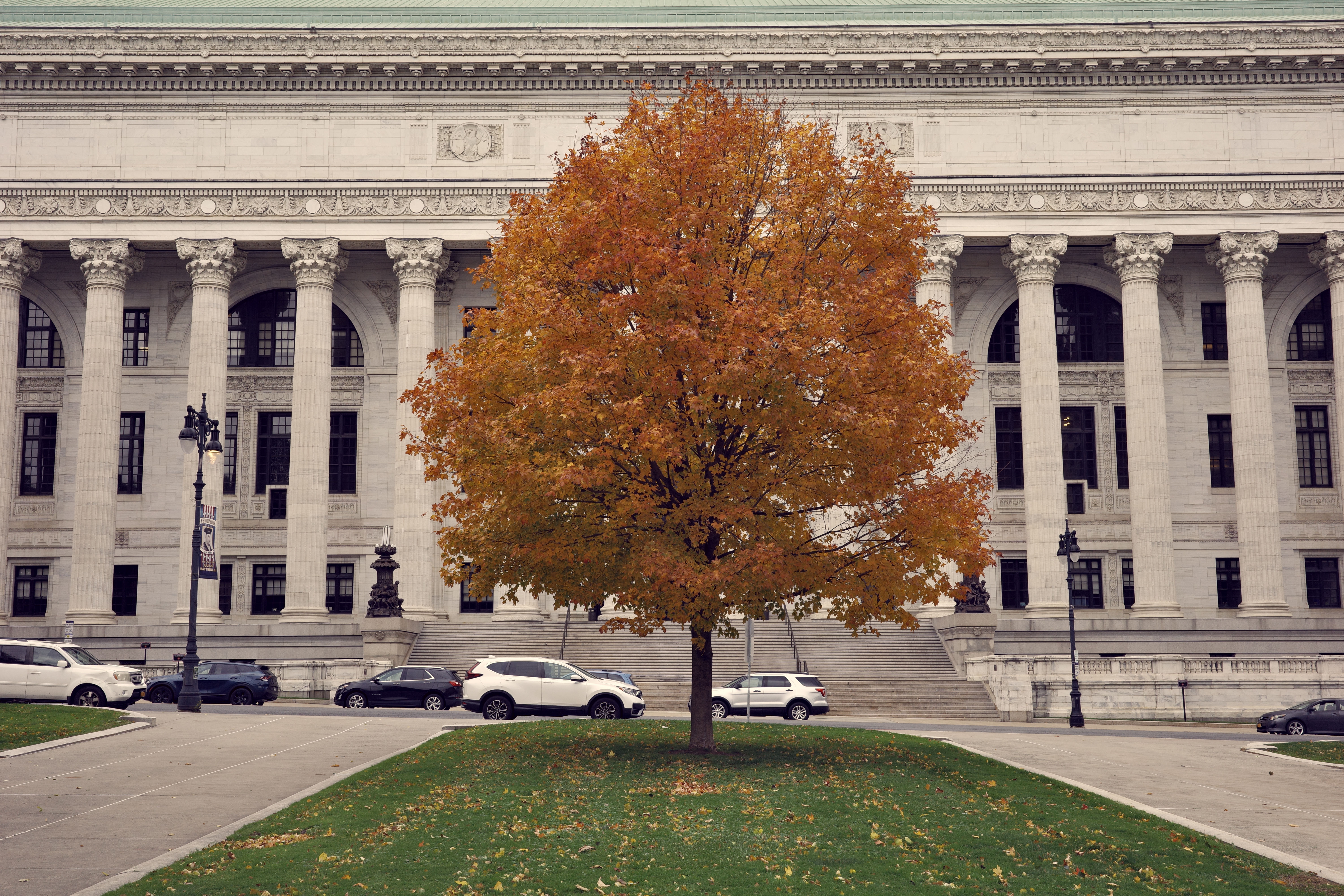 The State Court of Appeals Building was designed by architect Henry Rector for the original purpose of simple state offices. At the time, the Court was across the street in the Capitol. Modeled after the Ionic order on the Temple Athena Nike on the Acropolis in Athens, these columns are less dramatic than their towering Corinthian neighbors at State Ed, however their finesse give the State’s highest court a fitting home – the Ionic order is rarely surpassed, and it takes more than sheer monumentality to do so. The fluted columns feature a very slight entasis that can be (correctly) difficult to see. The marble was mined, in the Ancient fashion, by prisoners at sing-sing. Inside is one of the grand interior architectural achievements in American history. The Henry Hobson Richardson designed court room was moved piece by piece from the Capitol to the new court. The carved oak paneling survived both the 1911 Capitol fire and a 1959 fire at the courthouse. The work was fine enough to elicit the compliment from the Lord Chief Justice of England that it was the “finest court room in the world”.