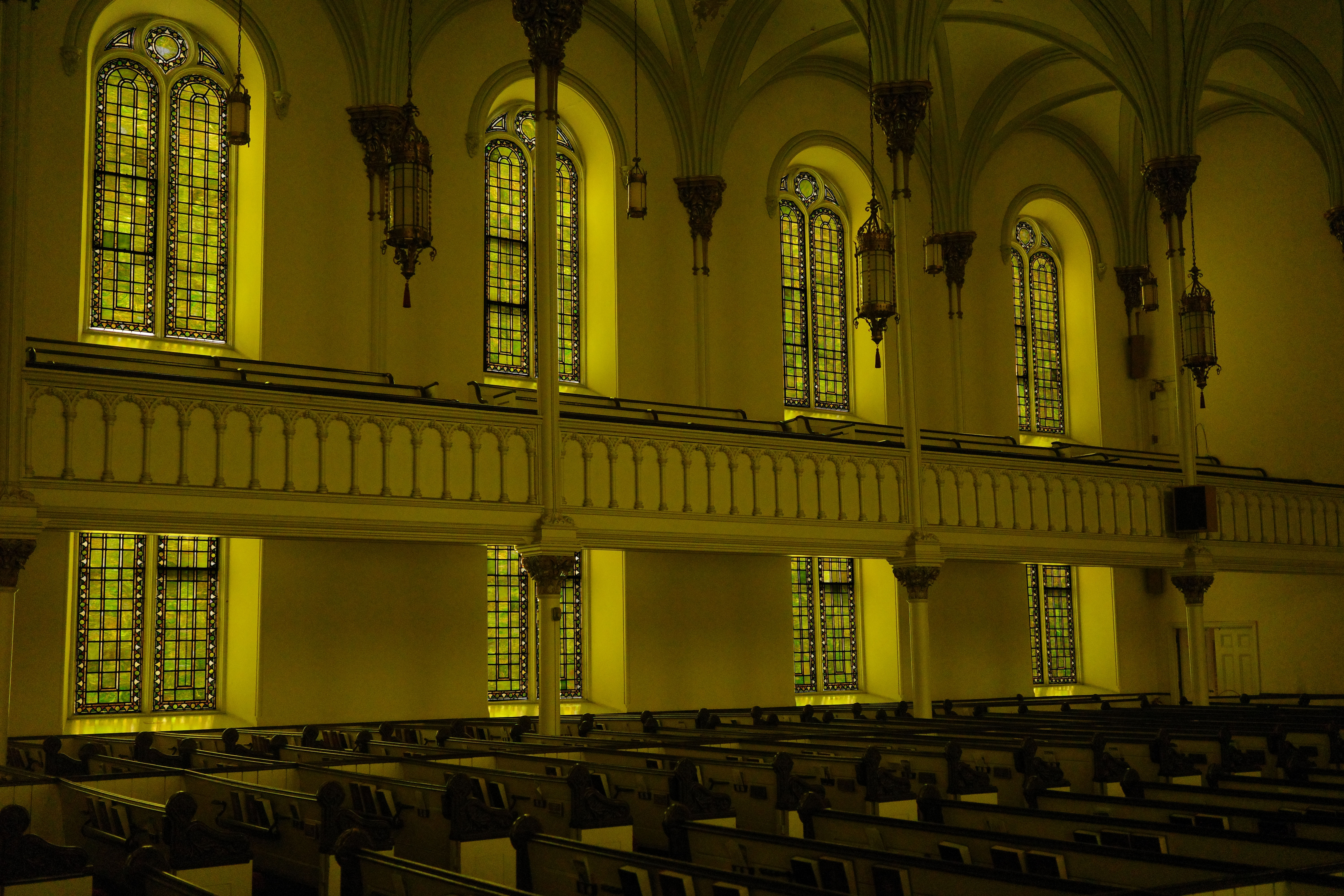 One of the great pieces of American cultural heritage found in New York State, the First Church in Albany is home to these effortlessly beautiful Tiffany windows. The barrel-vaulted nave is enclosed on both sides by six-bay aisles. Slender Christo-Corinthian style columns divide the bays and both the upper and lower registers are windowed. One of Tiffany's most subtle accomplishments, the windows of the nave are devoid of any of his famous iconography. Tiffany had at times even convinced synagogues to decorate with pictorial glass, but here the reformed church opted for plain windows with simple geometrical borders. This program is thoroughly Protestant. The quality of the glass used is second to none. The hue thrown by these windows is nearly tangible.