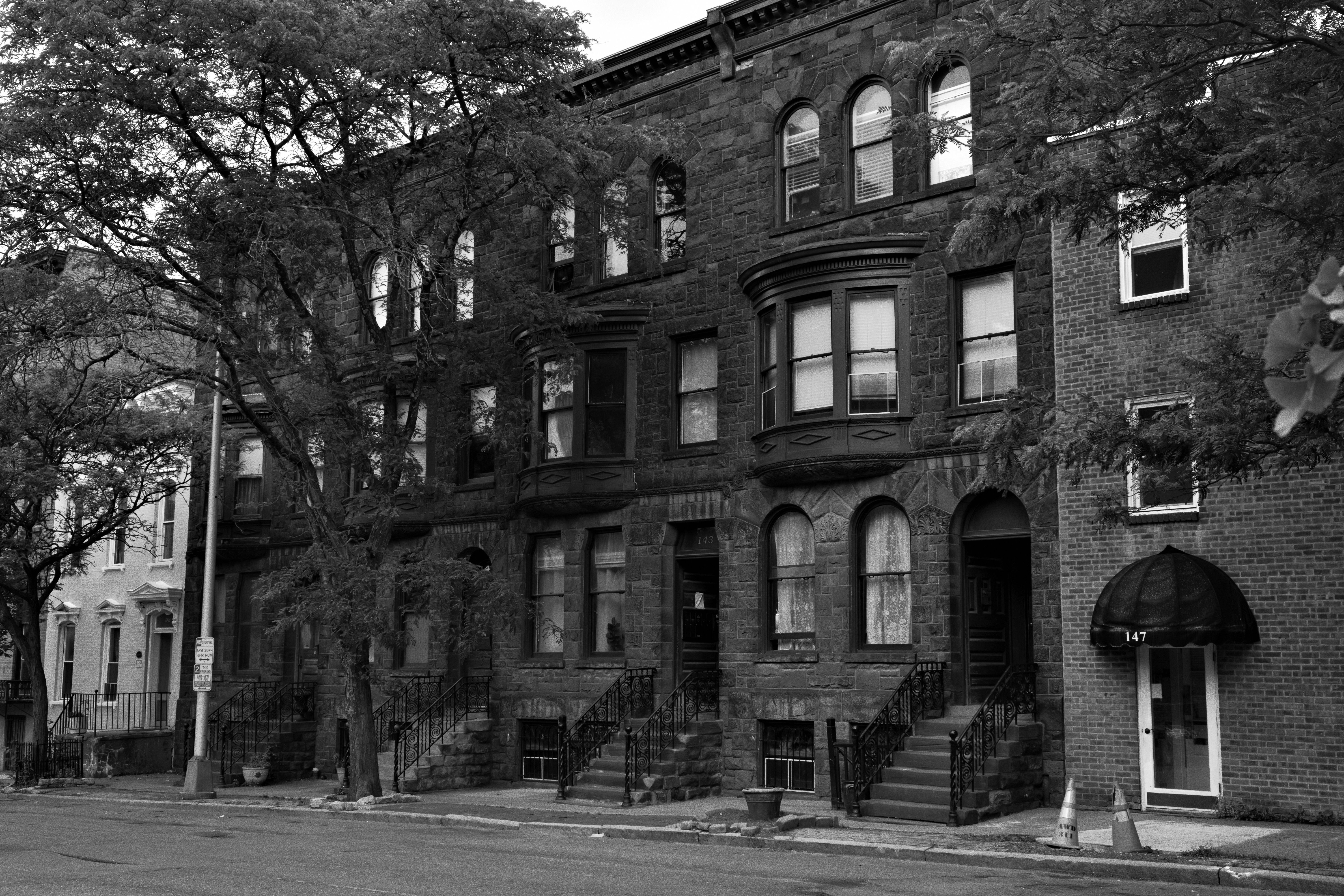 At the very outset of its run to the Hudson, State Street offers up one of its many architectural gems. 503 State Street, designed and built in 1886 by Walter Dickson, is a unique and lovely house. Romanesque qualities steer it away from ostentatiousness. The arched second story balcony sits above a deeply recessed doorway and two slit-windows. These features paired with the tall tree that obscures much of the house give it a sense of seclusion despite its location in the city. The eclectic brickwork offers a subtle enhancement to an otherwise largely proportional design.