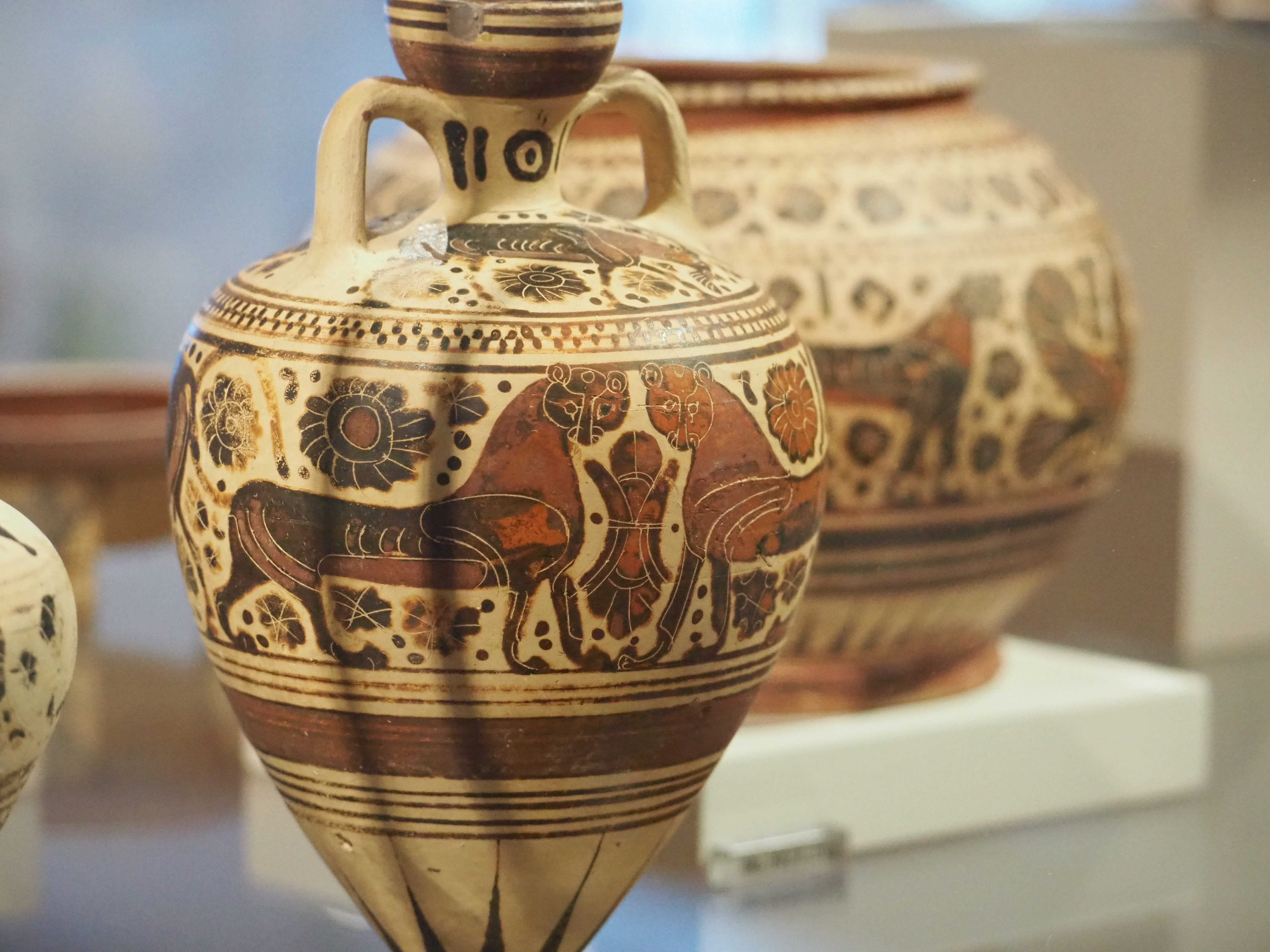Corinthian amphoriskos. 575-550 BCE. Before the Athenian craftsman was master the Mediterranean pottery trade was dominated by the Corinthians armed with an "oriental" style. This meant abundant floral adornment, exotic animals like lions and panthers, and a energy of movement not quiet achieved with the Geometric style.